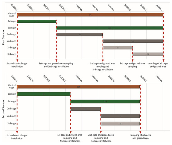 Biomass production was measured at least on one sampling station for each of the pasture plots, depending on its size, the diversity of the terrain, and the land cover. The location of each sampling station was selected on the basis that no bare soil was present, the surface was free of stones and perennial vegetation, and there was enough space to accommodate the required number of herbage protection cages. The cages were made with wire mesh (mesh size 1 × 1.2 cm), covering a circular area of 0.25 m2 and with a height of 0.7 m covered with a wire mesh lid. To anchor the cages, three iron rods were driven into the ground. The first two cages were placed at the start of the vegetative period, in October (Figure 2 and Figure 3). One of them (“control cage”) was sampled only at the end of the growing period (control cage). The second (“1st cage”) was harvested at ground level three months later (December) and a second time at the end of the season along with all cages, while a new cage (“2nd cage”) was placed nearby. During the second sampling, in early March, the 2nd cage, placed in December, was harvested and a new cage (“3rd cage”) was also placed. During the third sampling, from late May to early June, when herbage was almost dry, all four cages were harvested (the “1st cage” and the “2nd cage” for the second time). To record the standing herbaceous biomass in the plot during each sampling session, a sample was harvested from an area of 0.25 m2 representative of the overall field vegetation (“grazed area sample”) [43]. The final sampling was made at different periods each year due to the weather conditions that matured plants earlier in the second year: in the first year, this was in early June, while in the second in mid-May. After the completion of every sampling, the samples were dried in paper bags at 60 °C in an oven for at least twenty-four hours.
