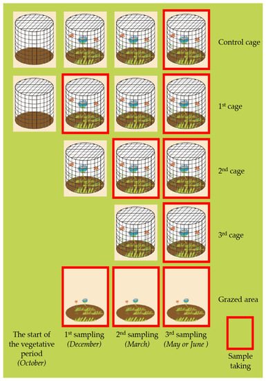 The sampling method: number of samples taken per year: control cage 1, 1st and 2nd cage × 2 = 4, 3rd cage 1, grazed area 3, in total 9.