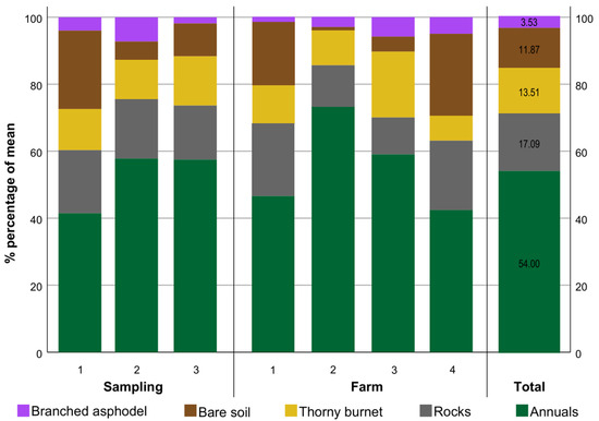 Land cover in five groups (annuals, bare soil, thorny burnet, rocks, and asphodel) per sampling period and farm.