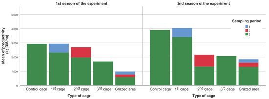 The differences in the average values of productivity per ha per day are statistically significant for the different cage types (Table 3). Average daily values in late spring (3rd cage) are much higher than all other periods and from the overall averages and this pattern stands for all individual pastures. The lowest values are recorded in the grazed area. The average values of the rest of the cages are relatively close. Significant differences are evident between the two seasons in all cages and grazed areas. The average productivity per day for the 3rd cage in the second season is almost double that of the first season and similar differences are found for the grazed areas. For the rest of the cages, the differences are present but are much lower. The overall pattern suggests a moderate biomass growth in the first 5–6 months and much more rapid in the 2–3 that follow. This difference is depicted when all samples taken per period are summed and the average dry biomass production per day in the 3rd-period sampling is 12.1 kg/(day*ha) for the first season, compared to 5.8 and 5.2 for the 1st and 2nd periods respectively and 21.6 kg/(day*ha) for the 3rd period of the second season and 9.8 and 4.4 for the 1st and 2nd periods respectively (the differences are statistically significant for the second season, ANOVA F(2,123) = 10.850, p < 0.001).
