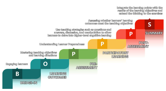 The BOPPPS Model is to divide the content into small units, and each small unit has its own “sequence” for segmented learning to maintain students’ concentration, and then all units are combined to form a course [5,6,7]. The BOPPPS Model was first proposed by Douglas Kerr at the University of British Columbia, Canada, in 1978. The core of this model is to emphasize teacher–student interaction through Bridge-in, Objective or Outcome, Pre-assessment, Participatory Learning, Post-assessment and Summary. It provides teachers with a complete framework and theoretical support for all aspects of on-site teaching, making the arrangement of classroom teaching more structured and effective (As shown in Figure 1). With the evolution of the times, the module has gradually evolved from a traditional face-to-face course to a student-centered, web-based one. After asking questions and obtaining resources, students can collaborate with others to complete their work and solve problems online to achieve the teaching objectives [7]. Therefore, with limited time, manpower, material resources and space to invest, the BOPPPS teaching structure can be used in conjunction with SDG-related thematic issues to achieve effective, efficient and effective teaching [8] to enhance the effectiveness of this study.
