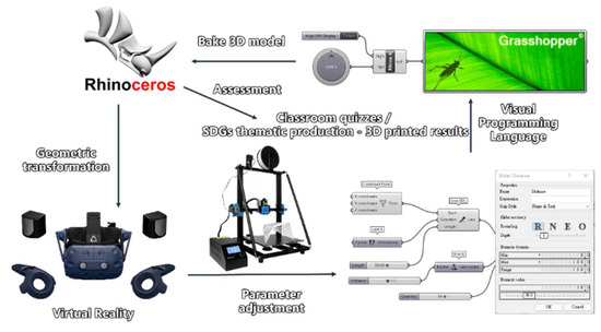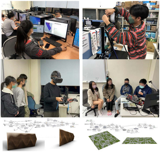 The scope of the course is parametric modelling, incorporating “SDG 11—Goal 11Make cities and human settlements inclusive, safe, resilient and sustainable”, “SDG 13—Take urgent action to combat climate change and its impacts”, “SDG 15—Protect, restore and promote sustainable use of terrestrial ecosystems, sustainably manage forests, combat desertification, and halt and reverse land degradation and halt biodiversity loss” and other related goals. The visual programming language (VPL) through the Rhino plug-in program Grasshopper connects the designed components with relational models and graphical interfaces to indirectly achieve the effect of automated scripting, allowing students who are not familiar with writing computer programs to perform parametric design through virtual reality (VR).There are 16 thematic unit in the course, including “Basic concepts of parametric design”, “Introduction and operation of parametric software”, “ Component set parameters and applications”, “Introduction and analysis of sustainable landscape cases”, “Case studies of sustainable landscape integration and extension”, “Application of virtual reality integration”, “Landform design”, “Permeable pavement design”, “Timber floor design”, “Green corridor design”, “Green wall design”, “Trellis pavilion design”, “Bamboo tunnel design”, “Pergola design”, “Sustainable environmental design and analysis” and “Applications of 3D printing”. Students were able to develop parametric models based on different design requirements, provide optimal designs under different design conditions and constraints and 3D print the results for evaluation (As shown in Figure 6).
