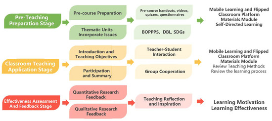 In this study, we used teaching observation, learning effectiveness assessment and qualitative analysis to understand the feedback of the participating students on the overall effectiveness of the learning objectives, steps and results set in the curriculum. In order to present the quality of teachers’ teaching, the teaching implementation procedure was divided into three stages: the pre-teaching preparation stage, the classroom teaching application stage and the effectiveness evaluation and feedback stage, and each stage is shown in Figure 7.