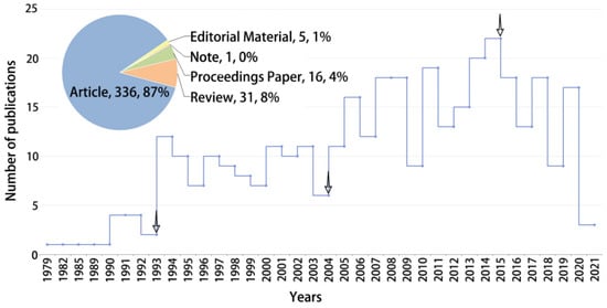 As of 2021, a total of 389 publications were retrieved related to underwater photosynthesis. There were 336 articles, 31 reviews, and 16 proceedings papers, accounting for 87%, 8%, and 4% of all WOSCC publications. Only five editorial materials and one note were found. Consequently, 367 articles and reviews accounting for 95% of all papers were used for the following analysis (Figure 1).