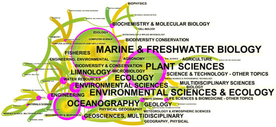The prominent journals determined through statistics on the distribution of related literature can help scholars quickly learn from crucial journals [48,49] and publish articles demonstrating their academic achievements [38]. The top 13 journals with the highest number of publications are shown in Table 1. All of these journals have published more than 100 papers. “Limnology and Oceanography”, “Marine Ecology Progress Series”, “New Phytologist”, “Aquatic Botany”, “Plant Physiology”, “Nature”, and “Plant Cell and Environment” were influential journals. Each of them has published more than 140 articles and has been cited more than 6000 times. Among them, “Limnology and Oceanography” ranked first, with 273 citations and 227 documents. The first citation year can be traced back to 1979 and continues today. It can be inferred that this journal is the essential traditional journal in underwater photosynthesis. Since 1990, journals such as “Marine Ecology Progress Series”, “New Phytologist”, and “Aquatic Botany” have become new forces with a relatively high volume of publications. It is worth noting that “Nature” and “Science” have published 142 and 100 papers, respectively. It is shown that significant results have been achieved at this stage.