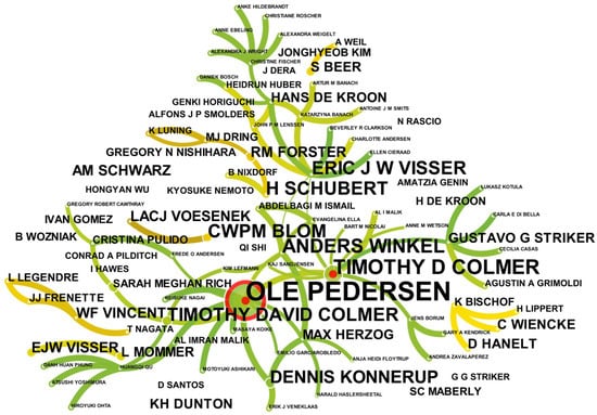 Through the analysis of the coauthor map, the group of scholars who work closely can be revealed. As shown in Figure 4, there were two closely cooperating groups. The team with Ole Pedersen as the core comprising Anders Winkel, Max Herzog, Dennis Konnerup, etc., mainly studied the physiology and molecular of waterlogging plants [19,51]. The other team with Timothy David Colmer as the core comprising K. A. G. Sand-Jensen, Gustavo G. Striker, etc., focused on plants’ physiological and biochemical characteristics and regulation mechanisms [7,11]. There are no large and many nodes in the coauthorship network, and the connection is single. This showed that the authors of underwater photosynthesis research were not closely linked, and the team effect was not apparent.