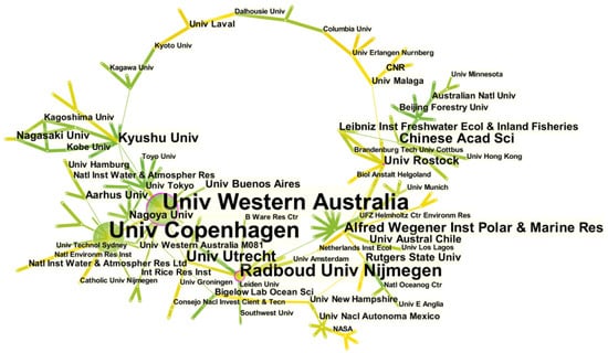 By analyzing the distribution of countries or regions and the number of publications and other indicators, we can understand these countries’ geographic locations and the field’s degree of attention and influences [35,36]. The United States ranked first with 64 publications, followed by Australia and Denmark with 56 and 48 papers, respectively (Figure 6). Although there were only 41 papers published in The Netherlands and Germany, the average citation frequency of each paper was high (76.22 and 60.61), which showed that their research was relatively in-depth (Table 4). China accounted for 2 of the top 8 funding units, which showed that China attached great importance to the development of underwater photosynthesis (Table 5). The centralities of the United States, Denmark, Germany, and England were greater than 0.3, indicating that these countries had greater contributions to the international exchange and were more active in international collaboration than other countries (Figure 6).