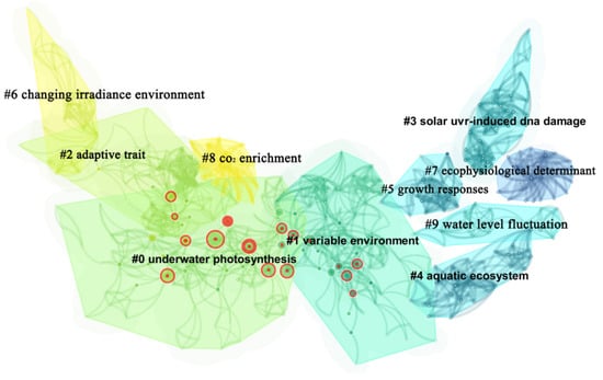 There were 74 members in cluster #1 with a silhouette value of 0.902. The study of this cluster focused on the influences of variable environments on underwater photosynthesis. When the external CO2 concentration was low, the increased gas exchange might lead to a higher assimilation rate and a lower underwater CO2 compensation point [13,59]. #3 had 46 members with a silhouette value of 0.985, which analyzed the impacts of sunlight on the survival of underwater plants (mainly algae) [60]. In the case of cluster #4, it had 39 members and a silhouette value of 0.989. The cluster mainly studied the aquatic ecosystem. For example, surface and underwater ultraviolet radiation in autumn, winter, and spring and its effects on phytoplankton photosynthesis were measured on the central coast of Chile [61]. Cluster #6 had 26 members with a silhouette value of 0.973, which studied the changes in underwater irradiance. It was found that the quantum yield of photosystem II (PSII) decreased rapidly with the increase in irradiance in the morning and increased with the decrease in irradiance in the afternoon [62,63]. Cluster #9 had 74 members and a silhouette value of 0.902. The articles focused on the water level fluctuation, which showed that the depth of waterlogging significantly influenced the formation of adventitious roots and plant growth [64]. Here, we can find that the studies gradually deepened from ecological and physiological determinants to the underwater environmental variables and water level fluctuations.