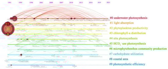 Keywords often represent an article’s core and main contents [37,79], and their cluster map effectively reflects research hotspots. Here, 10 keyword clusters in the constructed map were observed (Figure 8). The silhouette values of all clusters (#0 to #9) were at least 0.8, which showed the clusters were reasonable (Table 8). Among them, cluster #0 (underwater photosynthesis) was the largest cluster and focused on the morphological responses of plants to flooding [58] and the characteristics of underwater photosynthesis [76]. Cluster #1 (light absorption) focused on the effects of changes in seawater temperature and light conditions on the photosynthetic efficiency of aquatic plants [80]. Cluster #2 (phytoplankton productivity) studied the effects of underwater light intensity and inorganic carbon on phytoplankton productivity [81]. Cluster #3 (chlorophyll-a distribution) focused on ocean acidification and global warming effects on phytoplankton communities and seagrass growth [60]. Cluster #4 (in situ photosynthesis) and cluster #5 (HCO3− use photosynthesis) studied the in situ measurement of photosynthesis of aquatic plants [82] and how they use HCO3− to maintain photosynthesis when the diffusion of CO2 underwater was inhibited [25]. Cluster #6 (microphytobenthos community production) focused on the microphytobenthos community production and photosynthetic characteristics [63]. Cluster #7 (carbohydrate utilization) focused on the flood tolerance of terrestrial plants and leaf gas films to improve underwater gas exchange and enhance underwater photosynthesis [83]. Cluster #8 (coastal area) and #9 (photosynthetic efficiency) studied the photosynthesis of aquatic plants in the coastal area [67] and the influence of bathymetric changes and water flow on photosynthetic efficiency [84].