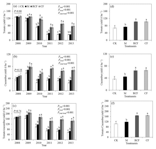 Fruit yield of (a) tomato, (b) cucumber, and (c) tomato/cucumber rotation. Average annual yield (d–f) in the control (CK), manure (M), and reduced conventional fertilization (RCF), relative to conventional fertilization (CF) for 2008–2013. The error bars indicate the standard deviations. CK: 0 kg ha−1 N; M: 362 kg ha−1 organic N; RCF: 992 chemical N + 362 kg ha−1 organic N; CF: 1515 kg ha−1 chemical N + 362 kg ha−1 organic N. The lowercase letters indicate the significant difference among the means each year, while each p value given upside right indicate the two-way ANOVA with year and treatment interaction.