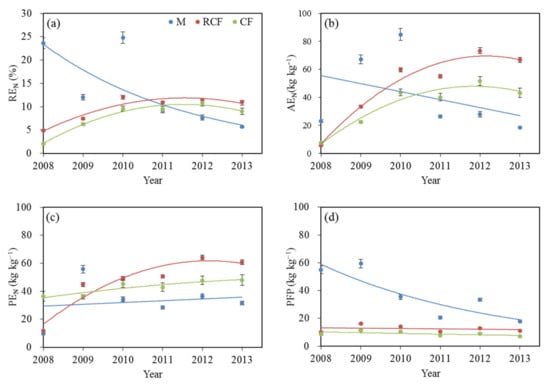 REN, AEN, PEN, and PFPN (Figure 2a–d) differed significantly (p < 0.01) between years and treatments. The REN, AEN, and PFPN of M showed a decreasing trend over the years. The REN, AEN, and PEN showed an upward trend to a relatively stable level year by year. By the end of this experiment, REN was 11.0, 9.0, and 5.7%, AEN was 66.7, 43.2, and 18.5 kg kg−1, and PEN was 60.7, 43.2, and 31.6 kg kg−1 in high to low order of RCF, CF and M, respectively. PFP was highest for M (17.9 kg kg−1), followed by RCF (11.1 kg kg−1) and CF (7.2 kg kg−1).