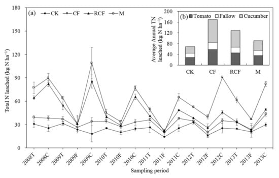 N leaching for 2008–2013. (a) Relationship between the sampling period and total nitrogen (TN) leaching. (b) TN leaching by treatment and vegetable rotation. T: tomato; C: cucumber; F: fallow. CK: 0 kg ha−1 N; CF: 1515 kg ha−1 chemical fertilizer N + 362 kg ha−1 organic N; RCF: 992 kg ha−1 chemical fertilizer N + 362 kg ha−1 organic N; M: 362 kg ha−1 organic N.