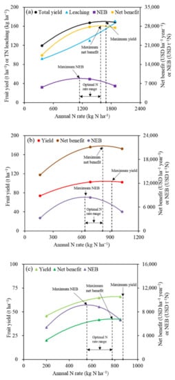 Yang et al. [15] found that TN leaching at less than 170 kg ha−1 would cause no environmental harm. In our study, the highest average annual N leaching rate was 170.7 kg ha−1 in conventional fertilization treatment, at the N application rate of 1877 kg ha−1, and N leaching was lower when the N application rate was reduced. Therefore, we consider a total average annual N input of less than 1877 kg ha−1 to be safe for the environment. In the tomato/cucumber rotation, the maximum yield was obtained at an annual N application rate of 1691 kg ha−1, using 12.3% less chemical fertilizer N than conventional fertilization (Figure 4a). Generally, the N application rate that maximizes the crop’s economic benefit is lower than that which maximizes yield [62,69]. Our findings were similar: the maximum net benefit occurred at an annual N application rate of 1583 kg ha−1 (108 kg ha−1 lower than the rate that maximized fruit yield), and using 19.4% less chemical fertilizer N than conventional fertilization. The maximum NEB was obtained at the annual N rate of 1143 kg N ha−1, using 48.4% less chemical fertilizer N than conventional fertilization. Maximum NEB reflects the most economical use of chemical N fertilizer. Further, using less N reduces N leaching and the risk of environmental pollution; hence, NEB may become a key indicator for determining chemical fertilizer N use in the future. We, therefore, recommend N application rates of 1143 and 1583 kg ha−1 for tomato and cucumber greenhouse farming, respectively, and reducing chemical fertilizer N application rates by 19.4% and 48.4%, respectively, relative to conventional fertilization. The maximum yield, net benefit, and NEB for tomatoes occurred at N application rates of 918, 821, and 634 kg ha−1, respectively (Figure 4b); for cucumbers, they occurred at 871, 778, and 556 kg ha−1, respectively (Figure 4c). In summary, our findings indicate that the optimal ranges of N application rates for greenhouse production of tomatoes and cucumbers are 634–821 kg ha−1 and 556–778 kg ha−1, respectively, under current experimental conditions.