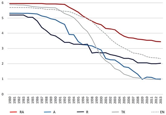 Indicators of the degree of liberalisation (United Nations Economic Commission for Europe, 2018), (RA—Railway, A—Airline, R—Road, TK—Telecommunication, EN—Electric and gas).