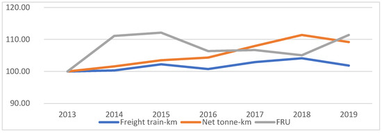 EU trends in train-km, net tonne-km, and number of freight railway undertakings [45]. (FRU—Number of freight railway undertakings).