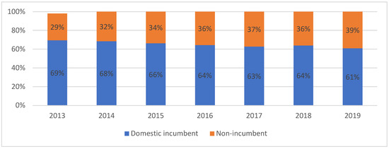 The analyses of the impact of liberalisation of railway freight transport in Europe [47,48,49,50] do not share a common conclusion. The number of new undertakings is on the rise, but international indicators, such as ton-kilometre and passenger-kilometre, are not correlated with said increase. Figure 3 illustrates the share in net tonne-km of the domestic incumbent and non-incumbent in the EU from 2013 to 2019. Liberalisation has opened up the markets and infrastructure availability, but what needs to be determined are the transport and economic indicators, such as operation, the quantity of transported goods, the number of passengers, as well as the financial success of the undertakings.