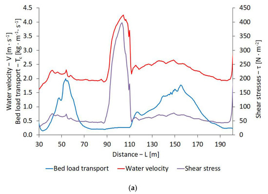 On the block ramp, bed load transport (no erosion or sedimentation) of Tc = 0.25 kg·s−1 was observed. This value was slightly higher than in the channel above the structure (Tc = 0.21 kg·s−1), because along reach L = 89, 90 m there was erosion (ΔH = −0.04 m). It was most likely caused by a calculation error of the system, which arose at the boundary between two erosion layers [55].