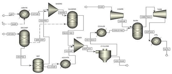The first two processes, drying, and pyrolysis of the fed stream (WP–DIS), are completed in an RYield reactor (DECOMP). Such a block decomposes the non-conventional stream of WP–DIS pellet to conventional (C, H2, N2, Cl2, F2, S, and H2O) and non-conventional (ash) components, based on ultimate elemental analysis implemented through a FORTRAN subroutine in a calculator. The temperature of the DECOMP block is set at 400 °C, which is indicated in the pertinent literature as the optimum temperature for pyrolysis of biomass [31]. The product exiting from DECOMP block (DECMPSS) is separated in a separator (SEP) into two sub-streams: a fraction of carbon that participates in gasification reactions (GASFED) and the remaining that forms char and ash (C-CHAR). The gasification fed stream (GASFED) is mixed in a mixer (MIXERG) with air (HOTAIR) preheated in a heat exchanger (AIRHTR) to reach the gasification temperature. RGibbs reactor (GASIFIER) is chosen to simulate the remaining two processes (gasification and combustion) involved in the gasification of WP–DIS pellets by minimizing Gibbs free energy. Each gasification reaction is restricted by assigning a specific temperature. This allows for reducing the deviation between predicted results and experimental values in terms of syngas composition and LHV [41,51].