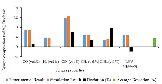 The difference between the results in terms of individual syngas composition, LHV of syngas, CCE, and CGE predicted through the developed model and experimental outcomes generate a deviation, which is calculated through Equation (2):