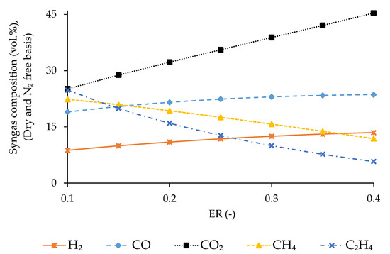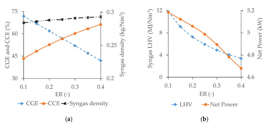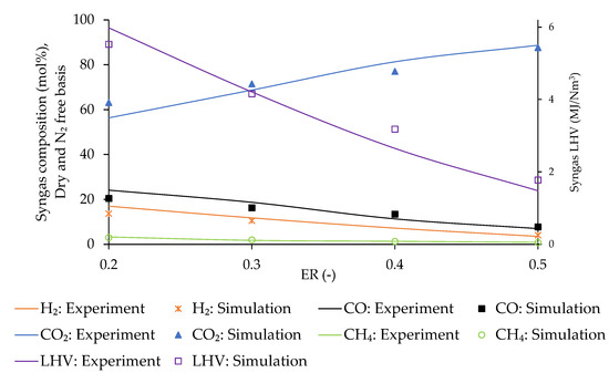 Syngas composition and LHV as well as the performance of the conversion process (CCE and CGE) during air-gasification of biomass depends on the quality of fed materials and operating parameters, such as temperature and equivalence ratio (ER) [24,25]. For the sake of completeness, ER is the ratio between the actual air to biomass weight fed to the gasifier to the stoichiometric air to biomass weight required for complete combustion [33].