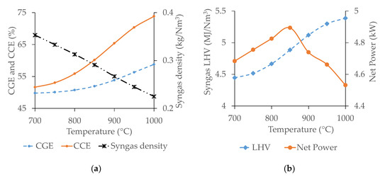 The ratio between the energy flow rate of the syngas and that of the material fed to the gasifier is defined as CGE and is evaluated according to Equation (5) [23]: