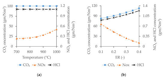 As shown in Figure 8, the concentration of NOX increases with the temperature as the NOX formation reaction is endothermic and moves in the forward direction when the temperature increases [67]. The concentration of the remaining two constituents (CO2 and HCl) in the exhaust does not significantly change with gasification temperature. Analysing the effect of ER, the concentration of NOX decreases with ER whereas that of CO2 and HCl increases. With the raise of ER, combustion reactions move into forward direction, and consequently the concentration of CO2 and HCl increases. At the same time, the raising of N2 concentration inside the gasifier with ER creates a dilution effect, reducing the temperature, and, thus, NOX formation decreases continuously [54,61,62].