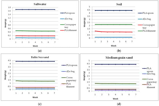 For the case of the medium-grain sand environment (Figure 2d), found mainly in urbanized locations, PLA materials presented the lowest degradation rates (0.0004 for spoon and 0.0002 g/week for filament) compared with the cocoa paper tray, which presented the highest rate, and it is already considered a reference material for biodegradability [21].