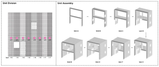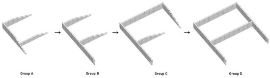 The building was built in eight units perpendicular to the ground from A to H, as shown in Figure 4. Considering the building range of robots at the same location, each unit was set to 7–9 layers. When building in groups, each unit is built lying flat on the ground, and after the robots finish building, the units are then erected vertically on the ground and connected.