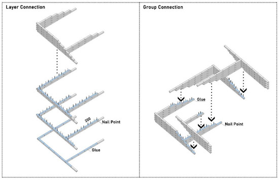 The construction process was conducted in sub-units, all operated by mobile robots. The connection between the timbers was achieved with glue and nails, as shown in Figure 6. Therefore, the steps of nailing and glue application are also the main tasks conducted by the robot arm.