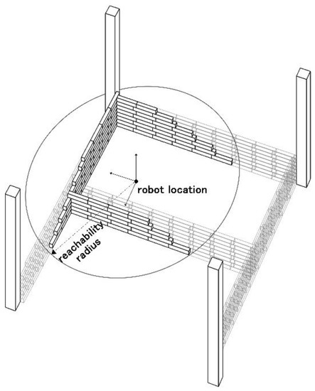 A total of 2168 timbers were required to construct this building with a length of 6.3 m, a width of 5.5 m, and a height of 6.2 m. The building is divided into units, with the largest number of layers in a unit of nine; the height of the units is 0.9 m. Before the construction process begins, the first step is to determine the operable range of the mobile robot in the same location as the construction range, as shown in Figure 7.