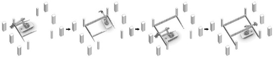 After this, to satisfy the minimized number of robot relocations, it can be precomputed that the entire assembly sequence needs to be built by dividing each unit into four groups. To complete this assembly sequence, the mobile robot needs to be displaced three times and complete the construction at each of the four computed localizations, as shown in Figure 8, after which the robot can interactively generate the assembly sequence at its current location and within its static range.