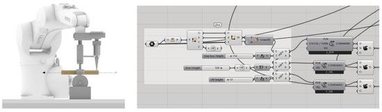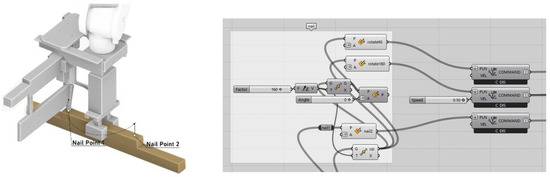 Nail: In addition to the glue application, the connection between the timbers is enhanced by nailing. The robot end effector is equipped with an air nail gun that can be fitted with nails longer than the length of the timbers. For each timber, the air gun is used to nail two nails at a distance of 200 mm, and the nailing operation is performed by holding the timber in the set position while the air gun shoots the nails. After this, the gripper releases the timber and the robot rotates 180° on the A6 axis and then performs the same operation, as shown in Figure 10.