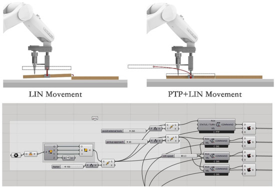 Place: In case of a collision with adjacent timbers in the process of placing, instead of the LIN motion method of straight-line motion between two points, the robot needs to run the moving route of clamping the timbers with the robot’s A5 axis as the main rotation PTP + LIN motion method, as shown in Figure 11.