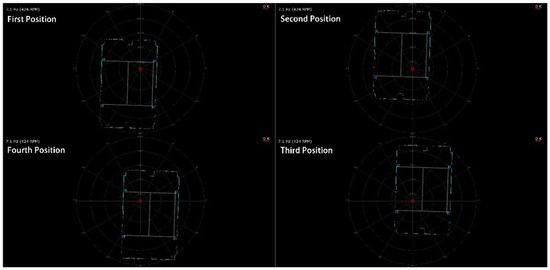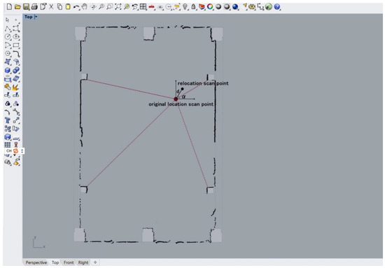 After the site environment is determined to be aligned with the designed CAD model construction site, the robot needs to be relocated for each displacement. This requires two radar scans at each designed positioning point and the use of key objects as identification objects. First, the scanned point cloud of each positioning point is obtained and interacts with the modeling software to generate a construction site map for each point before the experiment starts the construction step; after starting the construction, each displacement of the robot is rescanned after reaching the design position, and the key objects are used to align the two scanned point clouds before and after, as shown in Figure 13. If there is an error between the two scans, when the point cloud of the construction environment is aligned, the deviation of the center point of the two scans is the deviation of the robot’s position after displacement. Based on the angle and distance of the difference between the two points, the deviation between the displaced robot position and the original design construction positioning point can be calculated, and the relationship between the position of the construction object and the original robot construction point in the designed CAD model can be modified accordingly, as shown in Figure 14, so that the experiment can be carried out accurately after the displacement.