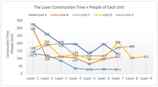 This construction was conducted by students lacking knowledge of the construction process and proficiency, and the number of students working on the construction varied greatly. From Figure 16, the total construction time of unit A including manual factors is the longest, and that of unit E is the shortest, so the efficiency of unit A is the lowest and the efficiency of unit E is the highest. It can be concluded that in this construction, each unit does not require much construction personnel, and the minimum number of construction personnel for unit E is 4, but the average efficiency is the highest; meanwhile, the maximum number of participants in unit A is 13, which shows that more than a certain number of construction personnel will affect the construction efficiency of the whole project. Unit A was the first construction unit, and the construction personnel were not familiar with the construction process, so they worked inefficiently and had the lowest average efficiency.
