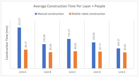 Comparison of construction time per layer for the first 5 units × people between manual and robotic construction.