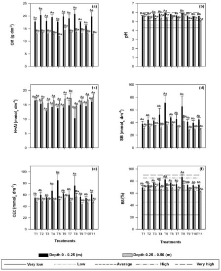 Organic matter—OM (a), active acidity—pH (b), potential acidity—H + Al (c), sum of bases—SB (d), cation-exchange capacity—CEC (e), and base saturation—BS (f) in soil samples collected after sugarcane cultivation in layers 0.0–0.25 m and 0.25–0.50 m deep as a function of treatments: T1: control—without application of sewage sludge compost (CSS) and mineral fertilization (MF); T2: 100% of the recommended MF for sugarcane; doses of CSS (Mg ha−1, wet basis) = T3: 2.5; T4: 5.0; T5: 7.5; doses of CSS (Mg ha−1 on a wet basis) of CSS + MF with NPK (kg ha−1) = T6: 2.5 + 50%; T7: 5.0 + 50%; T8: 7.5 + 50%; T9: 2.5 + 100%; T10: 5.0 + 100%; and T11: 7.5 + 100%. Means followed by the same letter (capital for soil layers and lowercase for treatments) do not differ from each other by Scott–Knott test at 5% probability (mean ± SE, n = 4). The lines represent the limits of interpretation established by Raij et al. [7] for soils in the State of São Paulo, Brazil.