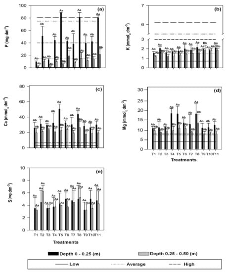 Phosphorus (P) (a), potassium (K) (b), calcium (Ca) (c), magnesium (Mg) (d) and sulfur (S) (e) concentrations in soil samples collected after cultivation of sugarcane in layers 0.0–0.25 m and 0.25–0.50 m deep depending on the treatments: T1: control without sewage sludge compost (CSS) and mineral fertilizer (MF); T2: 100% of the recommended MF for sugarcane; doses of CSS (Mg ha−1 on wet basis) = T3: 2.5; T4: 5.0; T5: 7.5; doses of CSS (Mg ha−1 on a wet basis) + MF with NPK (kg ha−1) = T6: 2.5 + 50%; T7: 5.0 + 50%; T8: 7.5 + 50%; T9: 2.5 + 100%; T10: 5.0 + 100%; T11: 7.5 + 100%. Means followed by the same letter (capital for depth and lowercase for treatments) do not differ from each other by Scott–Knott test at 5% probability (mean ± SD, n = 4). The lines represent limits established by Raij et al. [7] for soils in the State of São Paulo, Brazil.