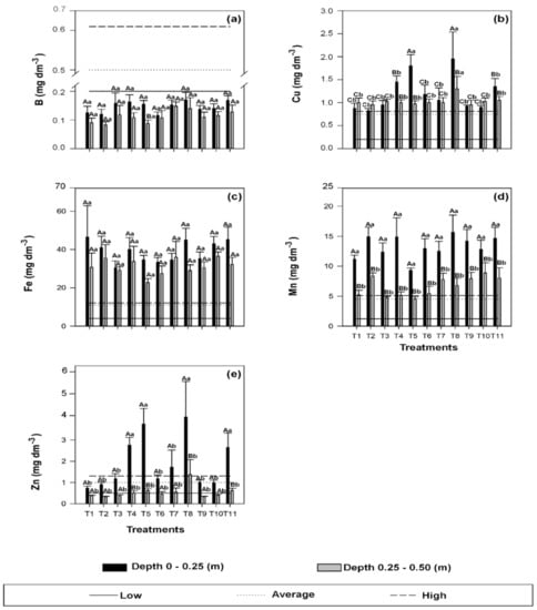 Boron (B) (a), copper (Cu) (b), iron (Fe) (c), manganese (Mn) (d), and zinc (Zn) (e) concentrations in soil samples collected after sugarcane cultivation in layers 0.0–0.25 m and 0.25–0.50 m depending on the treatments: T1: control without application of sewage sludge compost (CSS) and mineral fertilizer (MF); T2: 100% of the recommended MF for sugarcane; doses of CSS (Mg ha−1 on wet basis) = T3: 2.5; T4: 5.0; T5: 7.5; doses of CSS (Mg ha−1 on wet basis) + MF with NPK (kg−1) = T6: 2.5 + 50%; T7: 5.0 + 50%; T8: 7.5 + 50%; T9: 2.5 + 100%; T10: 5.0 + 100%; and T11: 7.5 + 100%. Means followed by same letter (capital for depth and lowercase for treatments) do not differ from each other by Scott–Knott test at 5% probability (mean ± SE, n = 4). The lines represent limits of interpretation established by Raij et al. [7] for soils in State of São Paulo, Brazil.