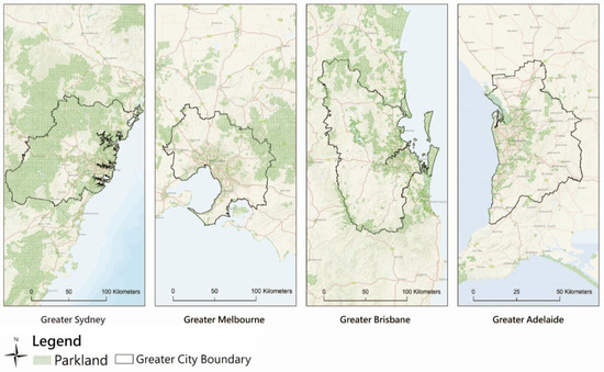 Each of the four study areas has a contrasting distribution of green space, as is shown in Figure 2, Brisbane has a considerable area of parkland both at the centre and beyond the administrative limits of the city, while Adelaide has a much more fragmented pattern of parkland around the city with the greatest concentration in the Adelaide Hills district of the city which is made up of a cluster of reserves and national parks such as Belair National Park and Sheperds Hills Reserve. Melbourne has a large patch of Parkland at the northeast boundary of the city, most of it belonging to the Dandenong Ranges National Park. Sydney has a wealth of substantial green space contained within the various National Parks that surround the city to the north, west, east, and south. The green space cover rate of Sydney is around 57%, and Melbourne takes second place at around 20%. Brisbane follows closely with about 18%, while Adelaide has the least at about 10%.