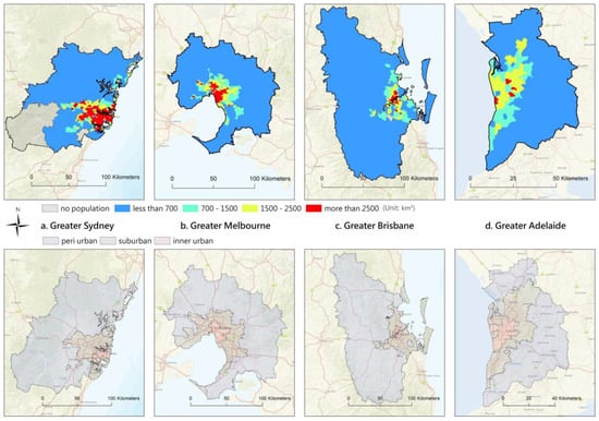 Figure 1 reveals various patterns of population density in the four study cities. All four cities are situated on the coast and are port cities. Sydney and Melbourne have total populations of over four million, while Greater Brisbane has around two million, and Adelaide has a population of over one million. Regarding the density, Melbourne has the highest of around 449 people per square kilometer; Adelaide and Sydney have around 390 people per square kilometer, and Brisbane is the least dense with only about 144 people per square kilometer.