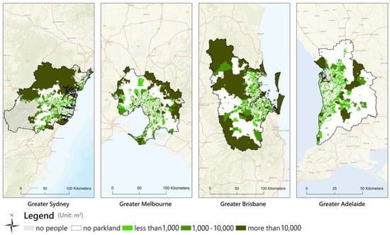 We have used the Greater Capital City Statistical Area [81] as the boundary of the four Australian cities selected, which are Sydney, Melbourne, Brisbane and Adelaide (see Figure 1). We have selected these cities as each has recently been developing new green space policies [72,82,83,84], and therefore a comparative analysis is timely. The population data and the green open spaces data are collected from the open database of the Australian Bureau of Statistics. The basic data unit is the Mesh Block (MB), and there are four Statistical Area Levels from Level 1 (SA1) to Level 4 (SA4). The newest geography standard of the version Edition 2016 is applied. The latest available census data on population and housing by Mesh Block are from 2017 [85]. The majority of the populated Mesh Blocks contain between 30 to 60 dwellings. There are twelve land use categories of MB, which are Residential, Commercial, Industrial, Agricultural, Parkland, Educational, Hospital/Medical, Transport, Water, Shipping, No usual residence, and Other. Among those, Parkland is used to construct the urban green spaces dataset (see Figure 2). In this research, we focus mainly on the availability of publicly accessible green spaces and the spatial inequality among residents.