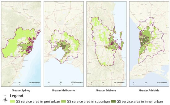 With regard to the 1000 m service zone (see Figure 8), with the exception of Adelaide’s 98%, all inner urban and suburban areas service more than 99% of the settled population. UGS within the peri urban areas of Sydney can service almost 89% of all the population, and Melbourne can also service around 86% of its population. On the other hand, both Brisbane and Adelaide cannot service around 30% of their periurban residents. As a consequence, UGSA from the role of Green Space itself, Sydney performs the best in all levels and subunits, and Melbourne and Brisbane are present in the middle position. Greater Adelaide seemed to need some improvement. It is also noteworthy that in inner urban areas, 100% of the population can reach UGS within 1000 m.