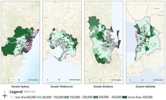 Visualization of UGS per capita (m2) in four selected cities in Australia.