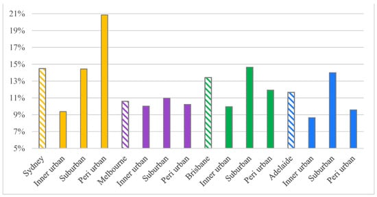 Although Sydney generally received the top score in terms of the area of accessible UGS within a 500 m radius, its inner city performs poorly. In Sydney’s inner city, green space that locals can access make up a only 9.37% of the area within 500 m. This puts it in third place behind Adelaide and Brisbane. Melbourne received the lowest overall score in accessing UGS; however, its inner urban areas perform the best overall, with accessible green space making up 10.02% of the land area within a 500 m radius around the dwelling. On the other hand, Brisbane’s green space accessibility metric puts it in second place; however, within suburban areas, 14.64% of the 500 m buffer zone are green spaces. Within metropolitan Adelaide, green space areas that residents in suburban areas are able to access occupy 13.99% of the accessible area within a 500 m radius, placing it third ahead of Melbourne; however, both Adelaide’s inner urban and peri-urban areas have relatively poor accessible urban green space area with only 8.65% and 9.58% of green space area within 500 m (Figure 11).