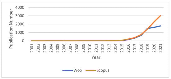 There has been a significant increase in academic interest in the topic of digital transformation between 2016 and 2021, as reflected in the hits in these index databases (Figure 1 shows the number of publications in the initial search of the WoS and Scopus index databases by keywords in the string “Digital Transformation” for the period 2001–2021): it increased from 146 and 204 in 2006 to 1784 and 3006 in 2021 in WoS and Scopus, respectively.