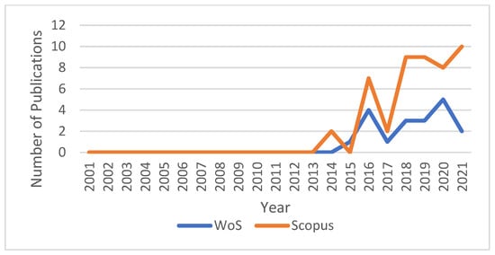 As for “Chief Digital Officer”, the number of hits is significantly lower (Figure 2 shows the number of publications in the initial search of the WoS and Scopus index databases by keywords in the string “Chief Digital Officer” for the period 2001–2021) and ranges between 17 and 45 publications in WoS and Scopus, respectively, during that period.