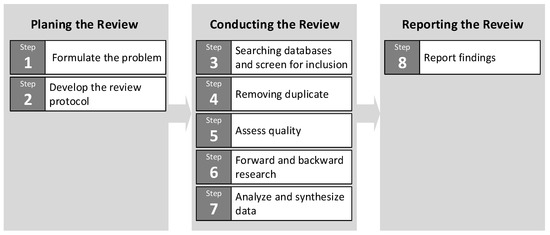 In the literature review process, descriptive methodologies were used, such as textual narrative synthesis, as defined by Xiao and Watson [] and by Barbara Kitchenham et al. [,,,]. The systematic review of the literature involved eight steps that Xiao and Watson [] categorised into three parts (Figure 3) The first two steps are part of review planning and include problem formulation and the review protocol development. The second part is dedicated to conducting the review, which begins with a database search and ends with the data analysis and synthesis. The last part reports the findings.