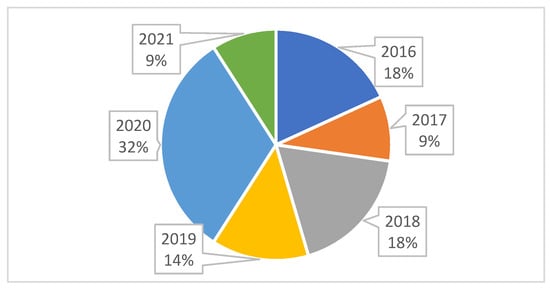 The papers from the final list dated back to the last six years, with nearly a third published in 2020 (Figure 4 presents the structure of the final list of papers by year of publication). Considering that the search was conducted in January 2022, it would be reasonable to assume that a number of papers published in journals or presented at conferences during the last quarter of 2021 are not indexed in these databases. Therefore, the number of papers published during 2021 should be regarded with a certain amount of caution—it is likely higher than what was obtained by our query.