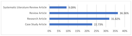 Slightly more than 36% of papers were categorised as review articles. The proportion of research articles made up almost 32%, while case studies represented about 23% (Figure 5 presents the structure of the final list of papers by publication type)—thus, more than 50% of papers were empirical in nature. Systematic review articles accounted for about 9%.